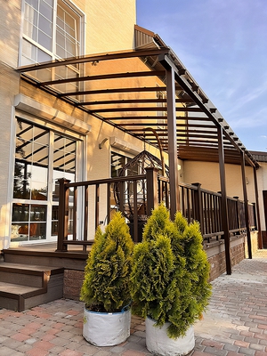 Навес-пристройка к дому из профнастила «хай-тек» односкатный с закрытыми боковыми панелями для авто